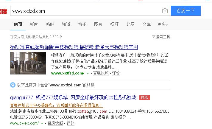 第二條信息,下面的地址,郵箱啊等等資料都是我們新鄉(xiāng)市天豐振動(dòng)機(jī)械公司的,但是打開(kāi)內(nèi)容,卻是一個(gè)很不的網(wǎng)站,我查看了一下源代碼,沒(méi)有我們公司的,這是什么情況呢,然后我又看百度快照信息,結(jié)果如下: